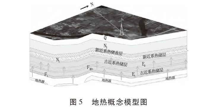 綜合與前人資料與本次淺部地溫測量、氫氧同位素地球化學測試、區內典型地熱井的抽水試驗等成果,分別從熱源、熱儲層、蓋層、地熱流補給及運移通道建立了勘查區熱儲概念模型(圖5)。