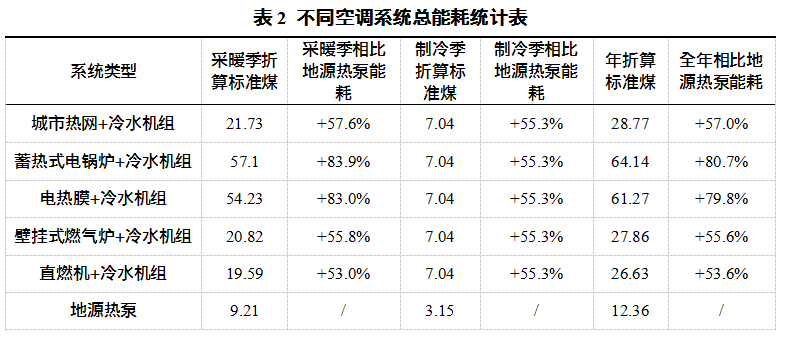 不同空調(diào)系統(tǒng)總能耗統(tǒng)計比較如表2所示。