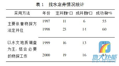 前幾年某單位在水文地質(zhì)領(lǐng)域剛起步,經(jīng)驗(yàn)不足,找水主要依靠物探工作,片面追求效率,急于求成,效果很不理想。后來(lái)意識(shí)到了基巖裂隙水地區(qū)水文地質(zhì)調(diào)查工作的重要性,及時(shí)調(diào)整了思路,加強(qiáng)了這方面的工作力度,取得了比較好的結(jié)果。近幾年來(lái)基巖裂隙水地區(qū)定井成功率見(jiàn)表1。